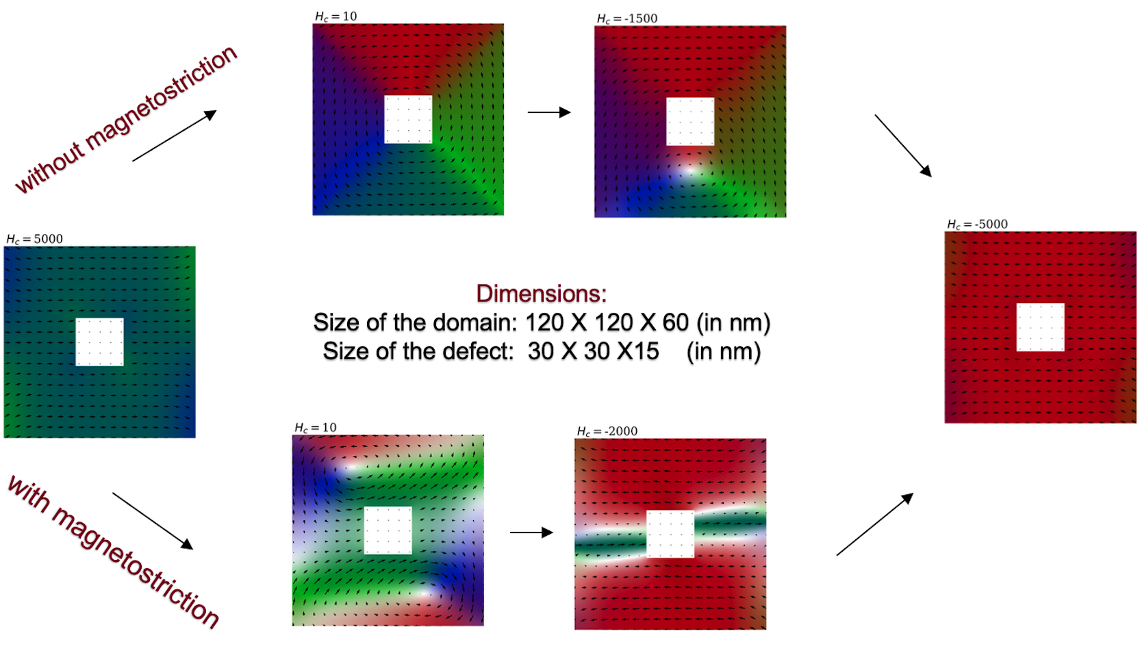 Right: Magnetization on the plane z=0 for a 3-dimensional material with a defect (white enclosed region). Colors correspond to different angles on the xy plane.